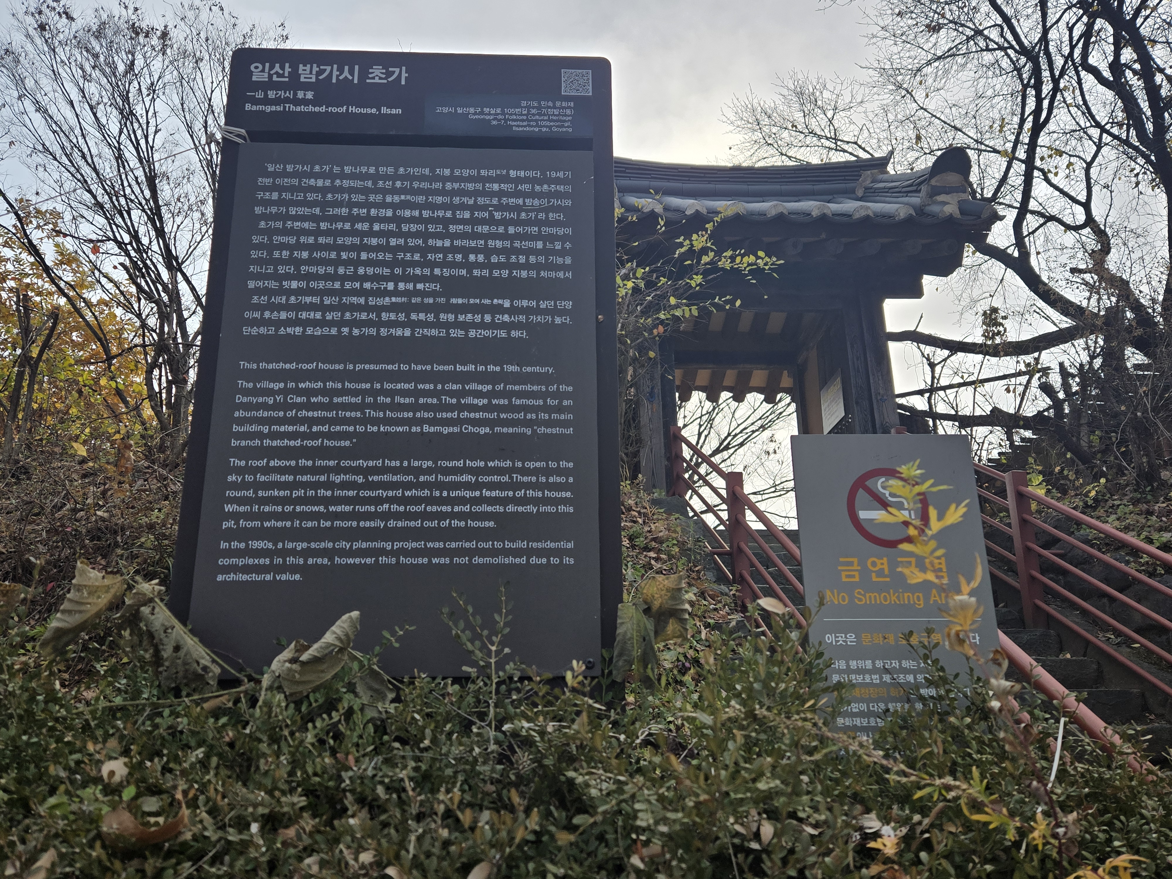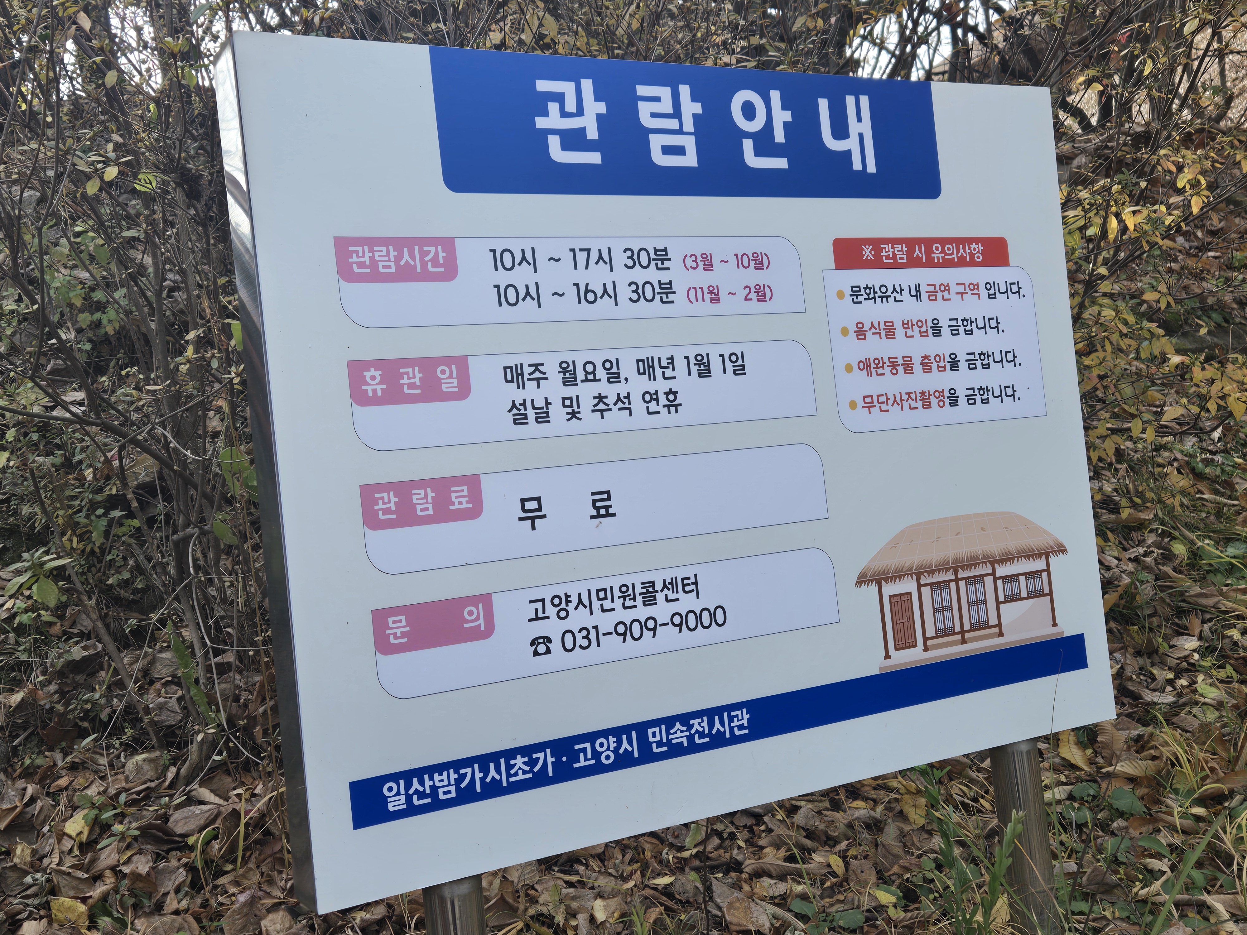 경기도 민속문화재 제8호로, 조선 후기 중부지방의 전통적인 서민 농촌 주택의 원형을 보존하고 있는 초가집입니다. 일산 신도시 개발 이전에 밤나무가 많았던 이 지역의 특성을 살려, 밤나무를 주요 재료로 사용해 지었다고 하여 '밤가시초가'라는 이름이 붙여졌습니다.